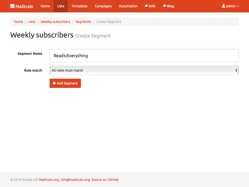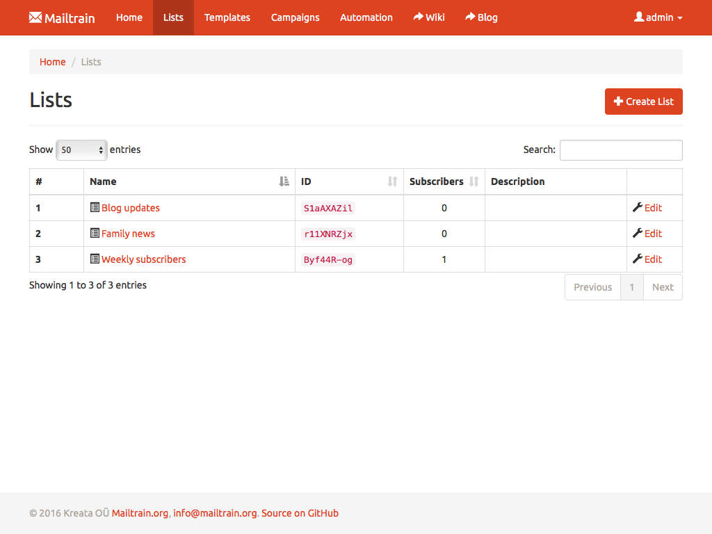 Mailtrain allows you to easily manage even very large lists. Million subscribers? Not a problem. You can add subscribers manually, through the API or import from a CSV file. All lists come with support for custom fields and merge tags as well.